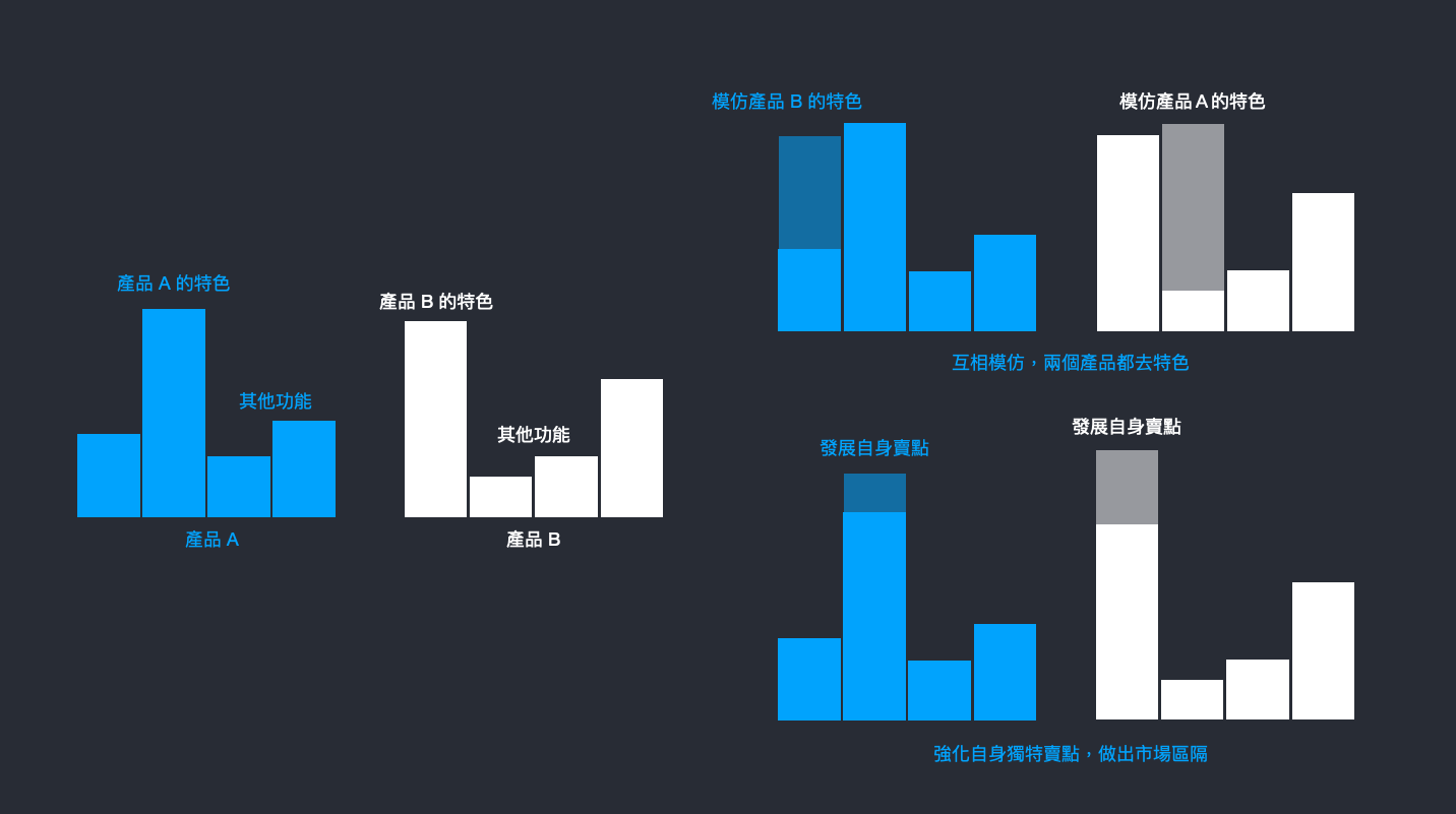 在進行競品分析的時候要小心,深入瞭解其他競爭品牌有哪些吸引其使用者的功能是一個很好的學習,但不代表把別人的強項來搬掉自己身上,會讓你的產品具備更強大的吸引力。相反地,最後最有可能發生的事情,凡而是你的產品失去特色而失去消費者的喜愛。
