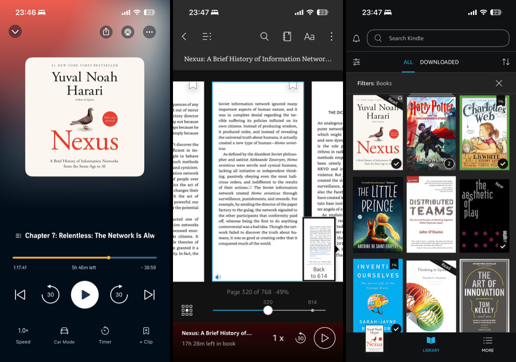 針對聽力,我覺得 Audible + Kindle 真是好東西。有聲書和電子書的組合可以透過讀跟聽接力完成一本書。上下班通勤的時間就很適合聽 Audible,可以一邊聽讀自己想要學習的主體、另一方面還可以增進英文聽力,真是一舉兩得。這幾個月不知不覺也聽了幾本書,從簡單的《Remote》到《The Subtle Art of Don’t Give a Fxck》、再到最近正在挑戰的《Nexus》,收穫新知的同時也可以增加練習機會。